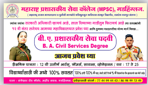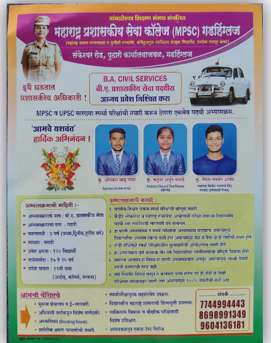At Maharashtra Administrative Services College (MPSC), Gadhinglaj, we are committed to transforming the dreams of young aspirants into reality by offering a unique and purposeful path to become government officers. Our specialized B.A. in Civil Services Degree is not just an academic qualification — it's a stepping stone to a successful career in MPSC, UPSC, and other competitive examinations. If you dream of serving the nation, riding in a red beacon car, and taking up a respected government position, this is where your journey begins.